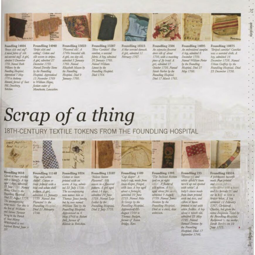 (photo: Selvedge Magazine (Issue 36, Sept/Oct 2010, pg 37). “Scrap of a Thing: 18th Century Textile Tokens from the Foundling Hospital.”)