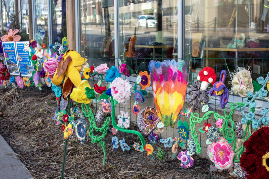 In December 2023, Textile Center put out a call for fiber art flowers to help us create a winter garden outside of Textile Center. Nearly 800 fiber art flowers were donated by 200+ community members of all ages and skill levels!