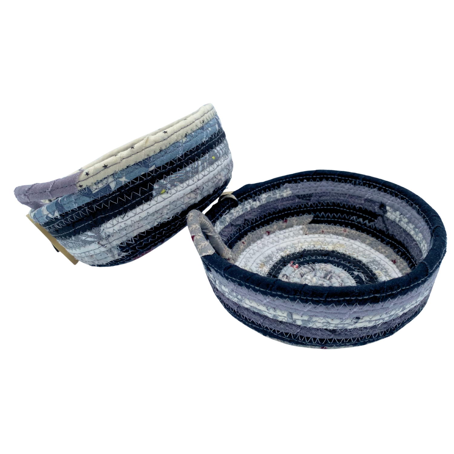 Baskets coiled from fabric scraps.